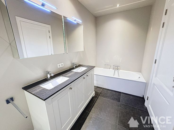 De moderne badkamer is uitgerust met zowel een bad als een douche, waardoor je kunt kiezen tussen ontspanning of een verkwikkende doucheroutine.