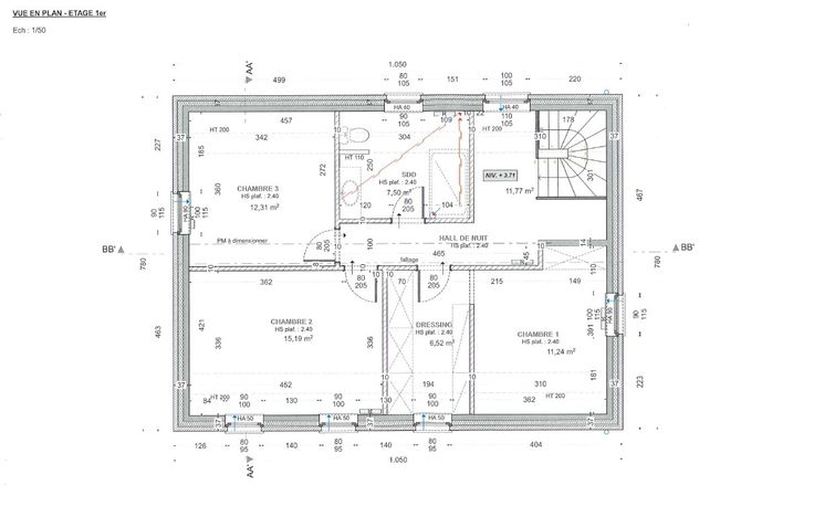- Au 1er étage: un hall de nuit, une salle de douches ( douche, meuble lavabo, WC ), et 3 chambres dont une avec un coin dressing.