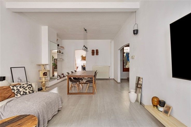- Een ruime leefruimte (Ca. 50m²) met veel lichtinval op een laminaatvloer.
