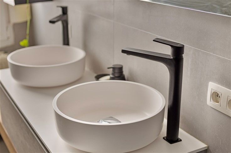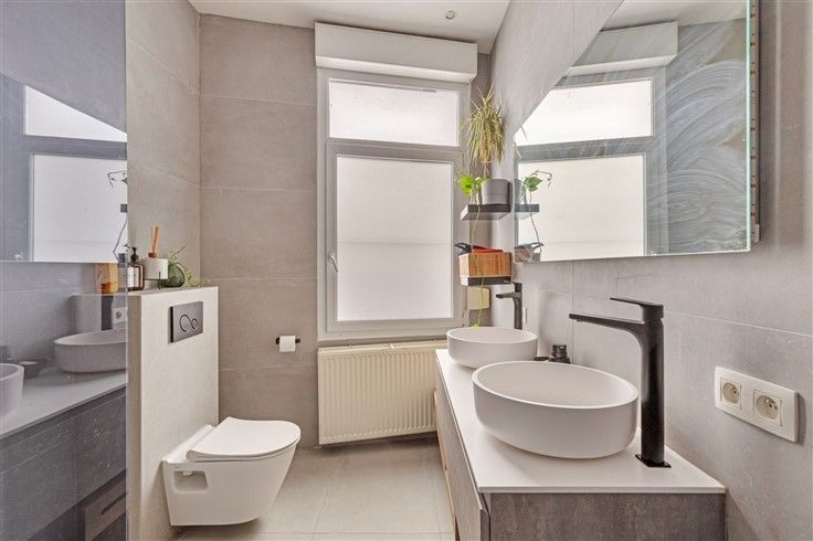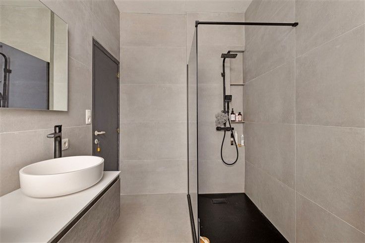 - Hier vinden we een vernieuwde badkamer terug die is voorzien van een inloopdouche, dubbele lavabo en toilet.