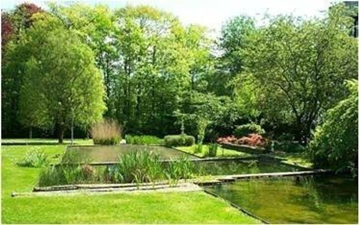 Rondom het gebouw zijn er aangelegde tuinen met waterpartijen.