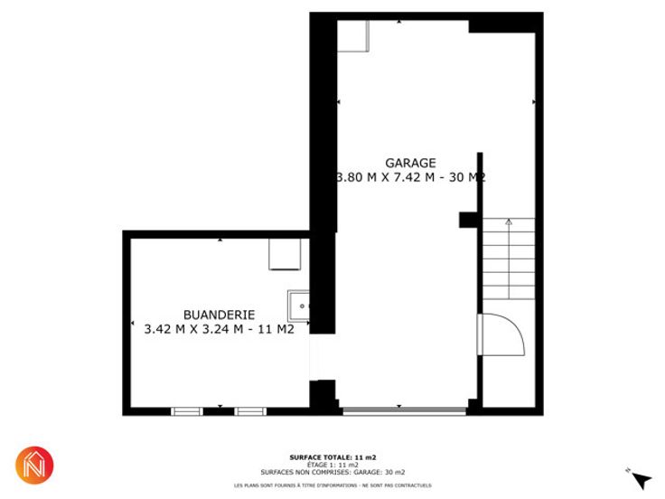 Au rez-de-chaussée, vous bénéficierez d'un garage spacieux de 30 m², capable d'accueillir deux voitures, ainsi que d'une buanderie pratique pour faciliter votre quotidien.