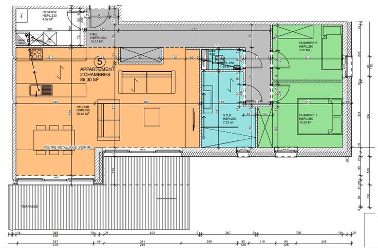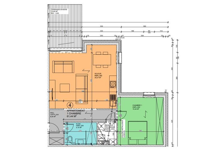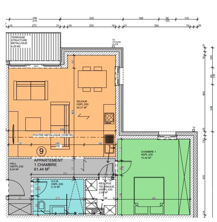 Composition : hall, séjour avec cuisine équipée, local technique, salle de bains avec douche et WC ou WC indépendant , 1 chambre ou 2 chambres.