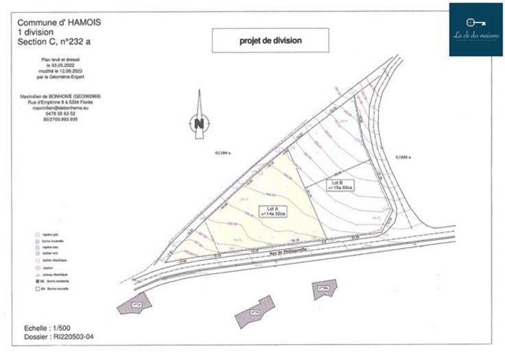 OUPS TROP TARD :: La clé des maisons vous propose ce magnifique terrain à bâtir de 1500 m2 avec une superbe vue sur les campagnes. Situé à Hamois dans une rue très calme. Vous serez séduit par sa superficie et sa localisation. Cerise sur le gâteau, ce terrain est libre de constructeur et n'est pas situé dans un lotissement. A la campagne mais proche de toutes les commodités (Hamois centre, Ciney et à 5 min de la N4). Opportunité à découvrir sans tarder. Ce terrain fait partie d'une ensemble de +- 2900m2 (projet de découpe dans les photos). Possibilité d'acquérir les lot A et B ensemble parce qu'ils ne sont pas encore bornés. La rue est équipée en eau, électricité. Prix: 105 000 €. Contact et infos : Anne 0496/12 64 40 ou info@lacledesmaisons.be.