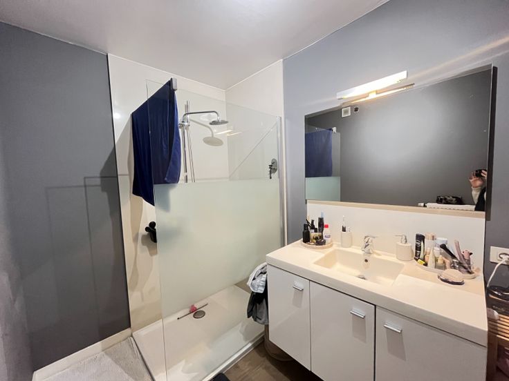 De badkamer is uitgerust met een wastafel in meubel en inloopdouche.