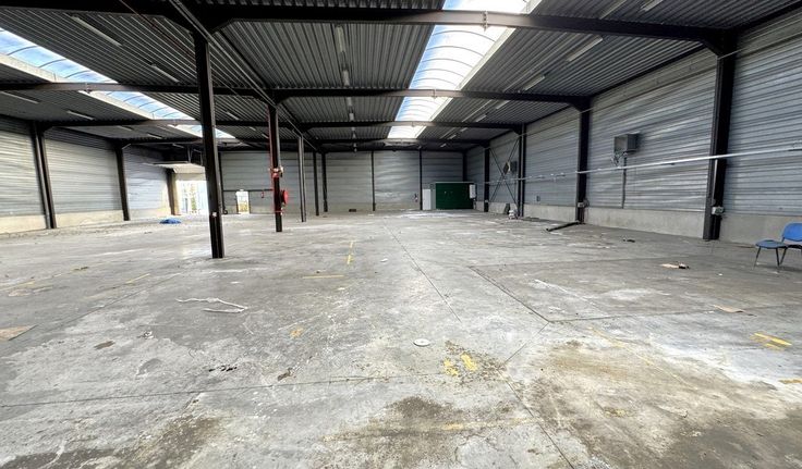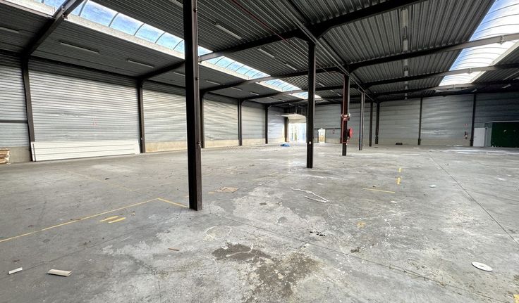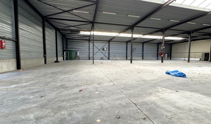 Specificaties magazijn: staalstructuur, gevel in aluminium bardagepanelen, 2 automatische sectionaalpoorten, geïsoleerd steeldeck dak met centrale lichtstraat, opbouw tl-armaturen, polybetonvloer, 2 toiletten, industriële cv op gas, 200m² buitenopslag