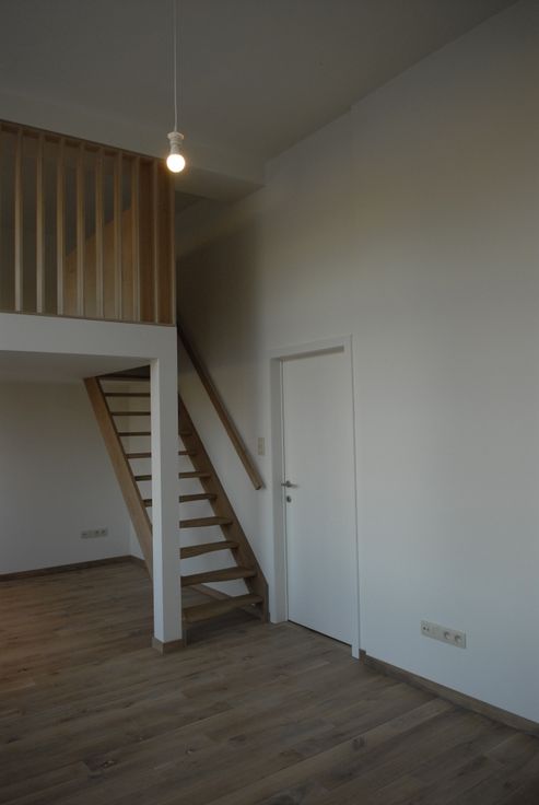 Aansluitend bevindt zich de leefruimte die door de grote ramen voorzien wordt van veel lichtinval. De slaapruimte kan ingericht worden op de mezzanine maar kan ook eenvoudig gerealiseerd worden op de begane grond.