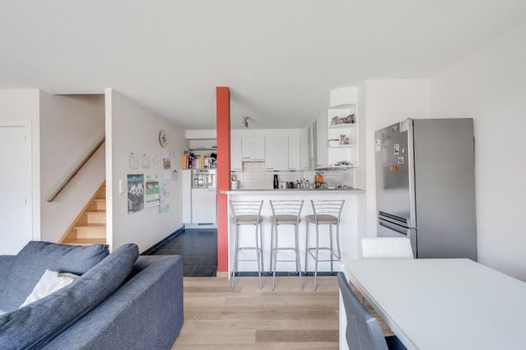 De inkomhal met berging en apart toilet, geeft toegang tot de ruime eet-en leefruimte met open keuken, aansluitend een terras dat uitzicht heeft op de gemeenschappelijke tuin.