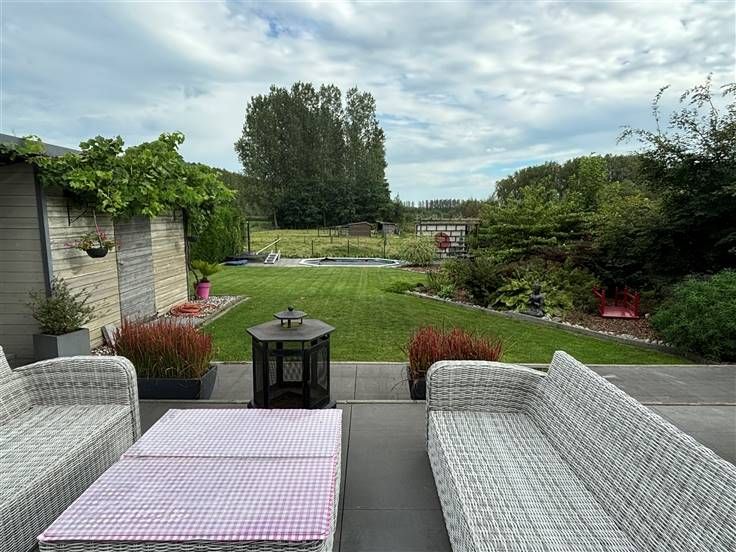 inkomhal, toilet, praktijkruimte/bureau of slaapkamer. Verder is er een grote woonkamer met open keuken die baadt in licht en uitgeeft via schuiframen op het terras en open landschap. Een grote berging en een ruime garage verhogen het comfort van deze woonst.