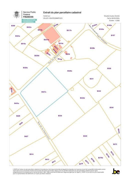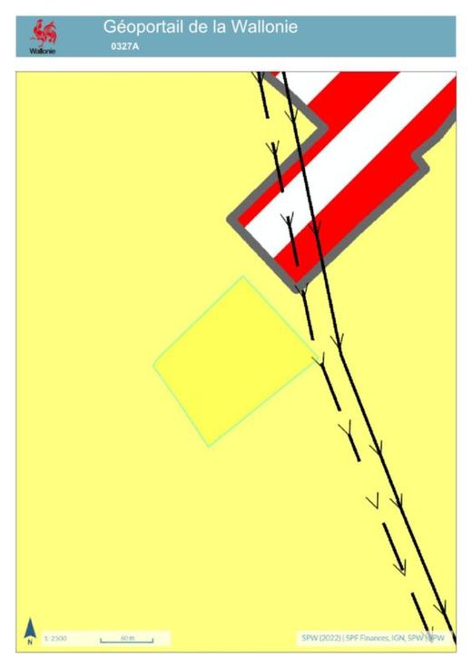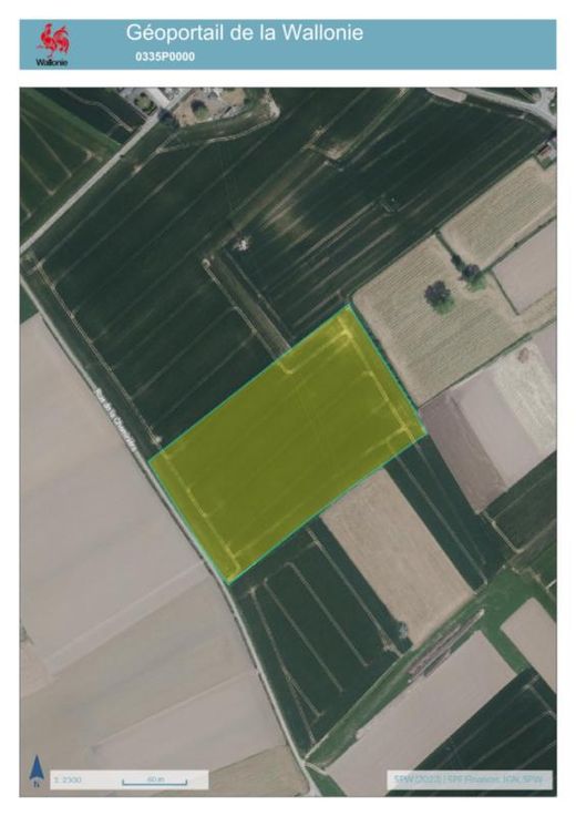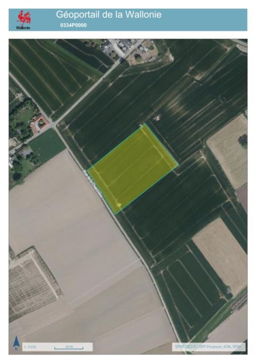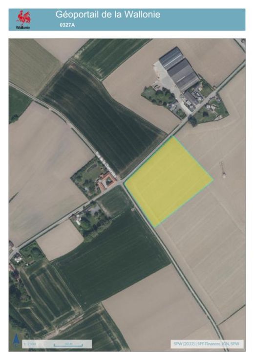 a)Une terre, sise « De breucq », connue au cadastre selon récent extrait cadastral section B numéro 0327AP0000, pour une contenance de un hectare quatre-vingt-sept ares vingt centiares (18.720 m²). Revenu cadastral non indexé : € 132,00. b)Une terre, sise « Chp de wattines », connue au cadastre selon récent extrait cadastral section B numéro 0335P0000, pour une contenance de trois hectares trente-trois ares cinquante centiares (33.350 m²). Revenu cadastral non indexé : € 236,00. c)Une terre, sise « Chp de wattines », connue au cadastre selon récent extrait cadastral section B numéro «0334P0000, pour une contenance de un hectare quatre-vingt-trois ares septante centiares (18.370 m²). Revenu cadastral non indexé : € 130,00. d) Une terre en zo se « Chp de wattinnes », d’une contenance approximative d’un hectare vingt-neuf ares quarante-cinq centiares (1ha 29a 45ca) à prendre dans la parcelle connue au cadastre selon récent extrait cadastral section B numéro 0328AP0000, d’une contenance totale d’un hectare quarante-cinq ares (14.500 m²). RC à définir. e) Une terre en zone agricole sise « Chp de wattines », d’une contenance approximative de quatre-vingt sept ares soixante-deux centiares (87a 62ca), à prendre dans la parcelle connue au cadastre selon récent extrait cadastral section B numéro 0329BP0000, d’une contenance totale d’un hectare trente-neuf nonante centiares ares (1ha 39a 90ca). RC à définir. TOTAL superficie: 9ha 21a 47ca