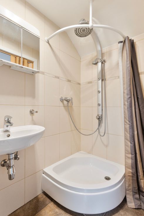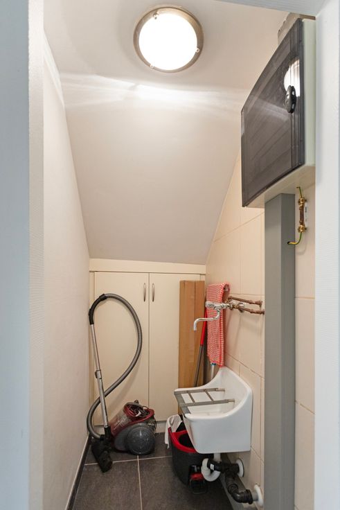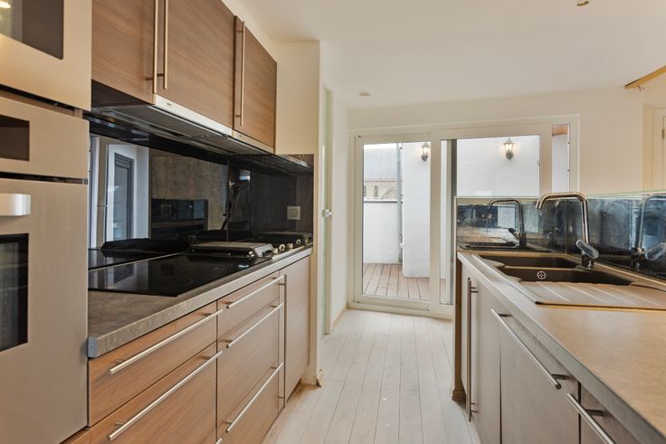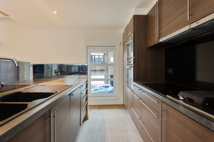Het duplex-appartement heeft een aparte inkom. Op het gelijkvloers en behorende tot het appartement een was-bergruimte. Via de trap komen we in het eigenlijke woongedeelte. Volgende opstelling vind je hier: een stijlvolle open keuken uitgerust met een microgolf-oven, afzuigkap, friteuse, vaatwasmachine, spoelbak, inductievuur, grillplaat en kunststof werkblad.