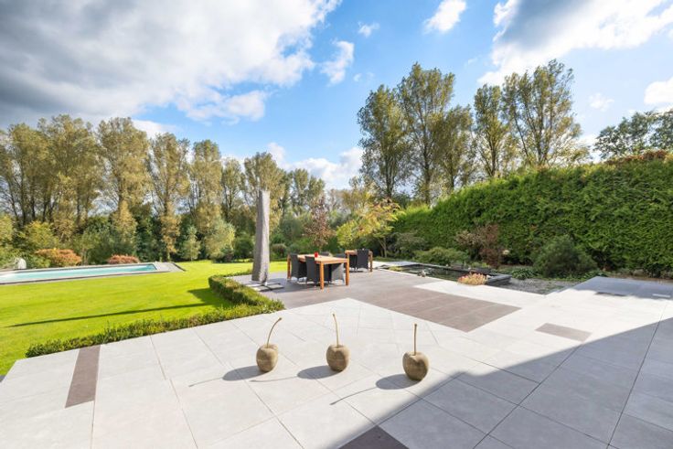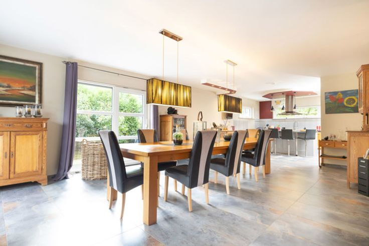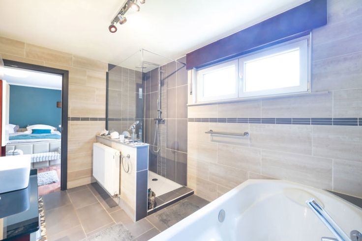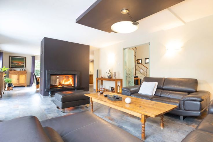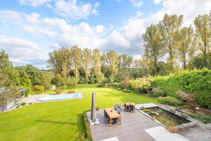 Au rdc : 160m² : un vaste hall d'entrée avec un vestiaire, un wc séparé, un magnifique séjour/salle à manger de 68m² avec feu ouvert (marbre), une belle cuisine ouverte super-équipée de 19m² avec îlot central, accès à la terrasse de 110m² (étang de 18m²), piscine de +- 30m² (sel), pool house et pompe à chaleur. Depuis le rdc, accès vers le garage et vers le bureau du 1er de 24m².