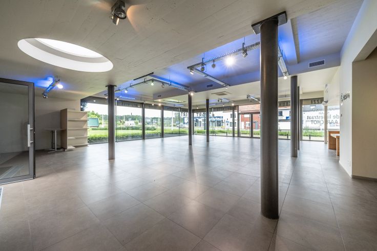 Uitstekende zicht locatie. Kwalitatief afgewerkt. Het pand bestaat uit een mooie toonzaal met grote vitrine, keuken, toilet, magazijn/garage met sectionale poort en terras.