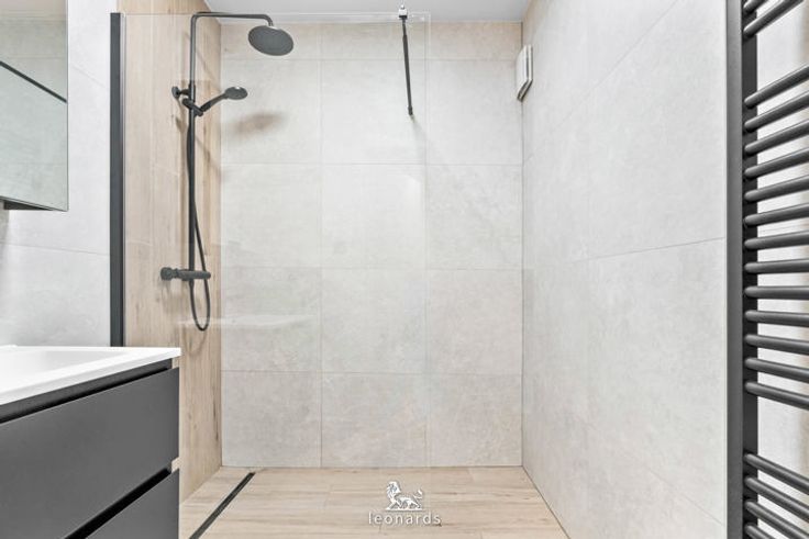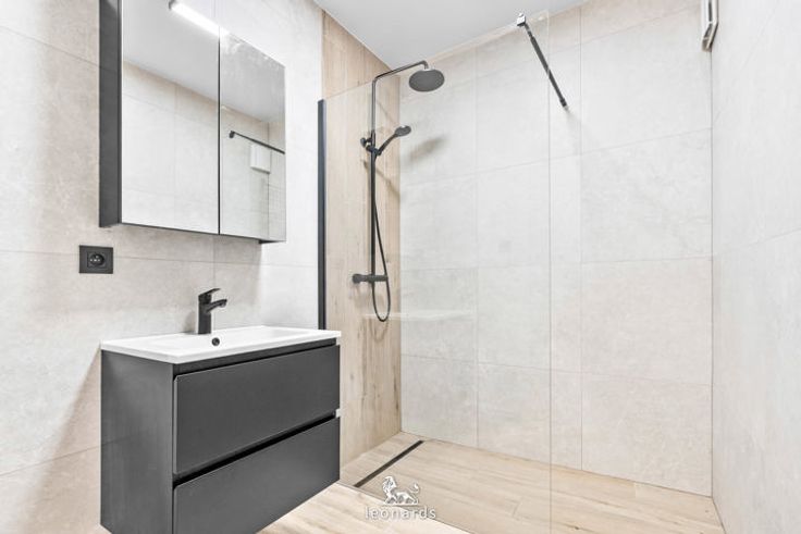 De stijlvolle badkamer is uitgerust met een lavabomeubel en inloopdouche.
