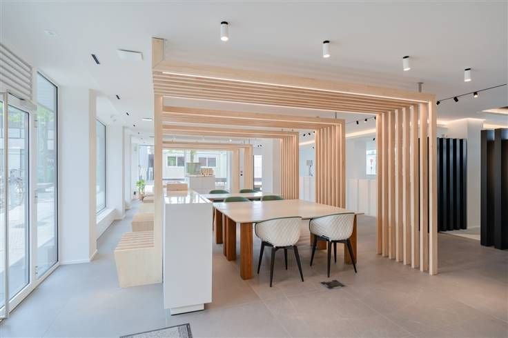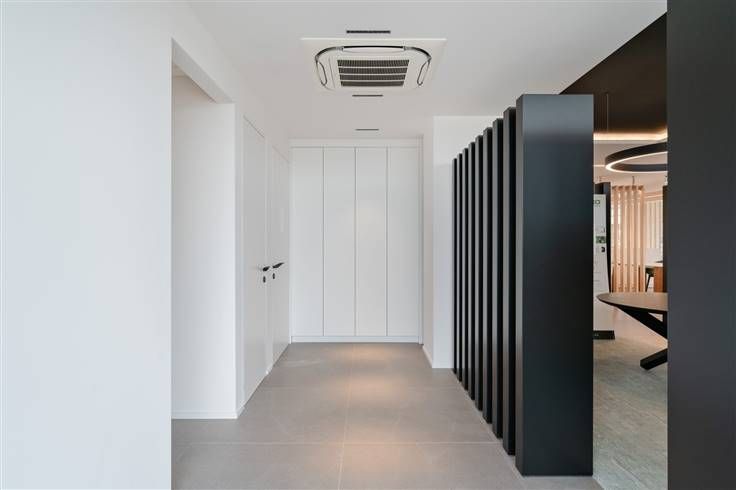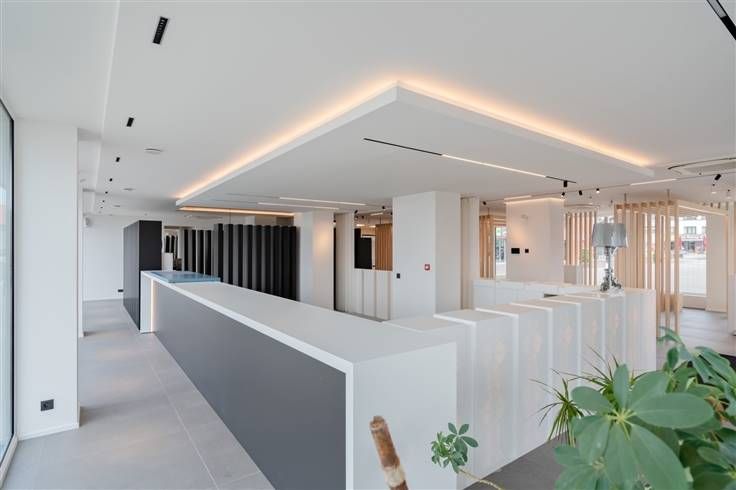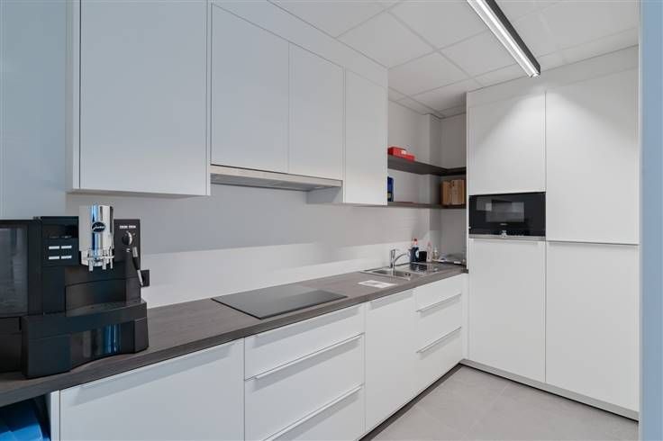 Wanneer wij het pand betreden treffen wij een stijlvolle, tijdloze & luxueuze inrichting aan. Zo is er de op maat gemaakte keuken die is uitgerust met de nodige inbouwtoestellen, zijn er verscheidene bureelkasten die net als de keuken op maat zijn gemaakt, is er de aanwezigheid van moderne verlichting en zijn er de nodige sanitaire voorzieningen met dubbel toilet. Met dank aan de grote raampartijen kunnen wij hier genieten van een aangename lichtinval. De grote raampartijen lenen zich uitstekend om te benutten als etalage. Dit in combinatie met de modernste technieken zoals de verwarming via warmtepomp (lucht-water) met vloerverwarming + koeling, een warmtepompboiler, 30 zonnepanelen, ventilatie type D, domotica, automatische schuifdeuren, ...