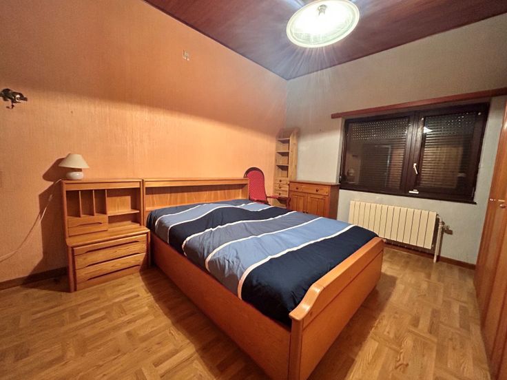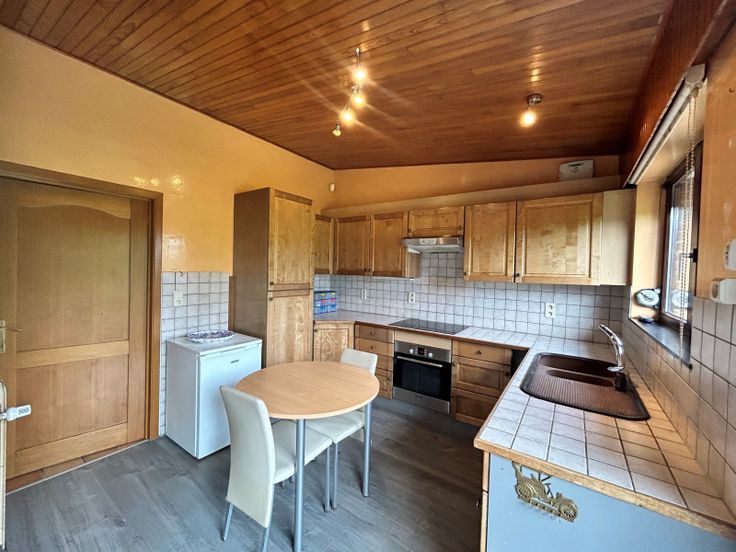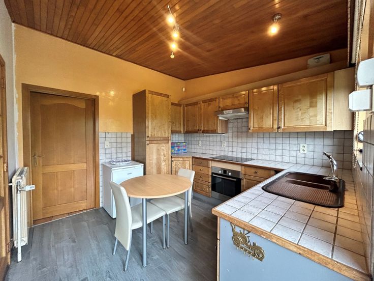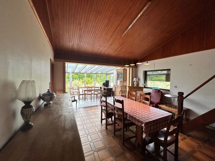 : . Gelijkvloers: Inkomhal, Woonkamer, Keuken, 2 Slaapkamer, Insteekkamer, Badkamer(s),, Veranda(s) . Kelderverdieping: Kelder . : : 387 Kwh, EPC certificaat nb., Total énergie primaire: 64278 kwh/an . Grond:, Tuin, Gehesen, Afrasteerd,, . Uitrusting van keuken: Keramisch kookvlak fornhuis, Oven, Wasemkap, Vaatwasmachine, Keuken meubelen . Elektrische uitrusting: Alarm, Thermostaat, Elektrische garagedeur, Elektrische blinden, Fotovoltaïsche panelen . Andere uitrusting: Schoorsteen, Dubbele beglazing, Blinden, Zonnetent . Vensters: Aluminium, Hout . Dakwerk: Dakpannen . Grond: Betegelen, Gelamineerde bevloering, Plakenvloer . Diensten: Autoweg, Bus: m, Winkelcentrum: m, School: m, Ziekenhuis