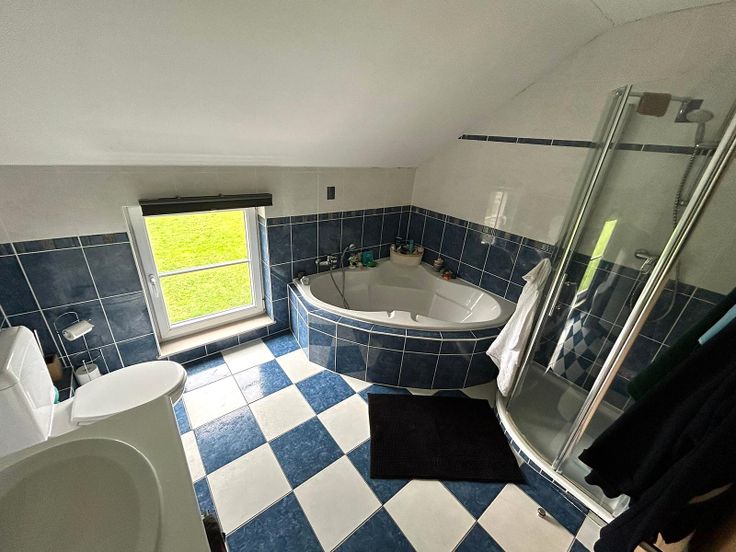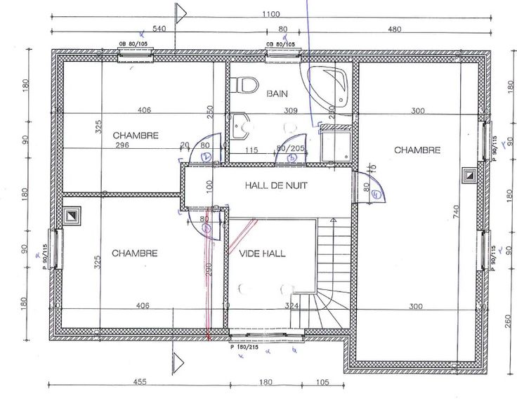 -A l'étage : d'un hall de nuit, d'une salle de bains (douche, baignoire, meuble lavabo, W), et de 3 chambres.