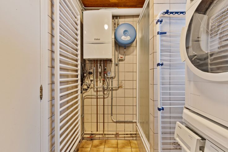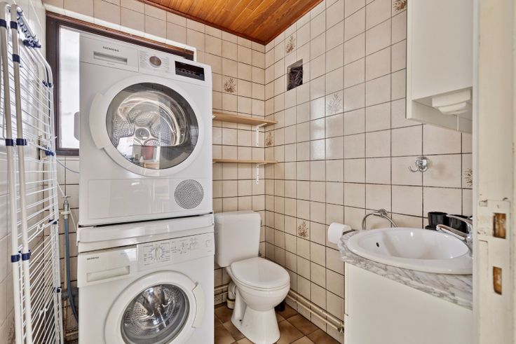 Grenzend aan de keuken ligt de badkamer, die praktisch is ingericht en volledig betegeld. De badkamer beschikt over een douche, toilet, wastafel en aansluitingen voor zowel een wasmachine als een droogkast, wat zorgt voor extra comfort in het dagelijks leven.