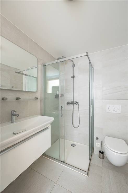 In de hal met grote, handige maatkasten, net voorbij de keuken, heb je rechts een apart gastentoilet met lavabo. Daarachter bevindt zich de betegelde badkamer, met een douche, grote lavabo met meubel en spiegel, een tweede toilet en aansluiting voor je wasmachine en droogkast.
