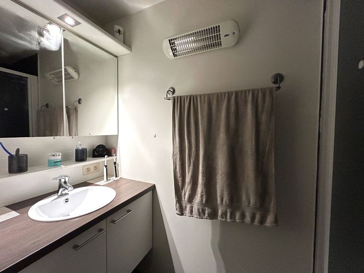 De badkamer is voorzien van een douche en een badkamermeubel met enkele wastafel.