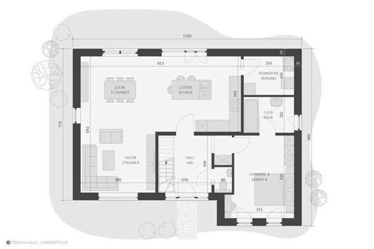 Nous vous proposons un projet de villa Qzen: Quasi Zéro Énergie, 100% traditionnelle. Cette villa affiche une performance énergétique de classe PEB A+, avec triple vitrage, 14 panneaux photovoltaïques et ventilation double flux. Le chauffage est assuré par le sol avec une pompe à chaleur. L'isolation comprend 14 cm pour les murs, 12 cm pour le sol et 44 cm pour la toiture. La maison est située sur un terrain de 2.659 m². La villa comprend au rez-de-chaussée: hall d’entrée, salon-salle à manger, cuisine non équipée, une buanderie, une chambres et SDB. À l’étage, elle offre 3 chambres, un dressing, une salle de bains, un espace bureau, meuble lavabo, appareils sanitaires et robinetterie inclus, et un WC de nuit séparé. Les plans peuvent être modifiés et adaptés selon vos besoins, avec un grand choix de matériaux sans supplément. La maison est livrée clé sur porte, construite de manière 100% traditionnelle avec un cahier des charges complet. Nous vous invitons à découvrir, sur rendez-vous, notre splendide maison témoin de Chaumont-Gistoux, en semaine et le weekend. Notre adresse: Chemin du Bonly en face du n°73, 1325 Chaumont-Gistoux. Le prix total du projet, TVA comprise, est de 472.486€. Ce prix fixe inclut la construction, l’architecte, le terrain, les frais de notaire, un budget raccordements de 5.000€, une réserve pour fondation de 15.000€, l’essai de sol, l’ingénieur, l’étude de stabilité, la PEB et le coordinateur sécurité. Pour plus d’informations, consultez www.teamcons