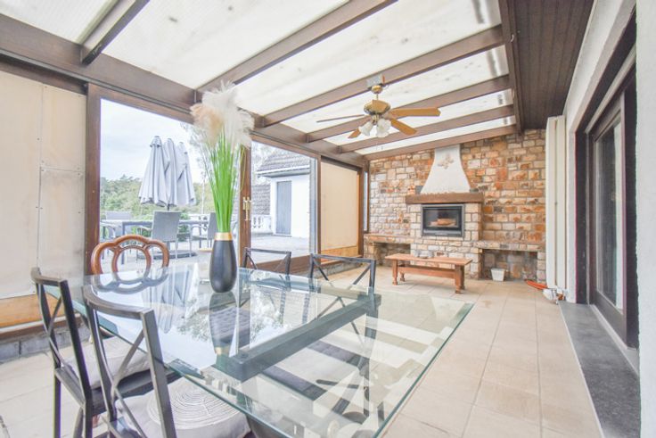 Le bien est composé (385 m² selon peb): au RDC : d'un grand hall d'entrée, un vestiaire, une toilette indépendante, un espace rangements, d’un vaste et agréable séjour lumineux ouvert, un bar, une cuisine équipée (frigo, four, taques vitro, lave-vaisselle, hotte, évier), un grand garage, une grande véranda (26m²) bénéficiant d’une cassette à bois ainsi que d’une vue sur la terrasse et sur les champs.