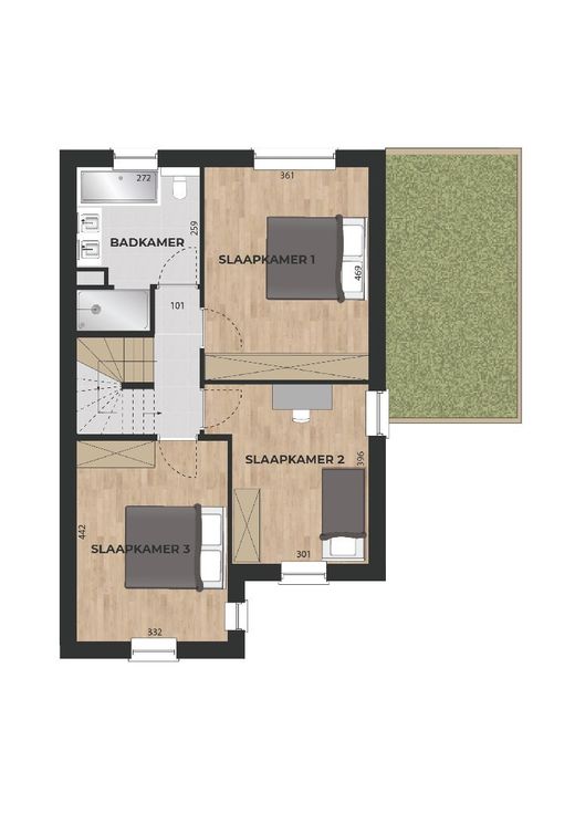 - VERDIEPING 1: Nachthal, slaapkamer 1 (4,69 x 3,61 m), slaapkamer 2 (3,96 x 3,01 m), slaapkamer 3 (4,12 x 3,32 m) en badkamer.