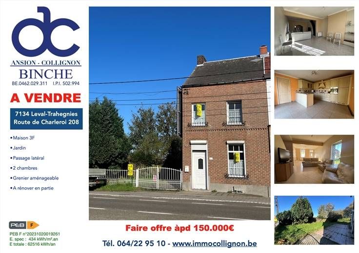 Sorry er is geen nederlandse vertaling beschikbaar. Leval-Trahegnies, à vendre, bonne maison d'habitation 3F avec jardin, se composant comme suit :