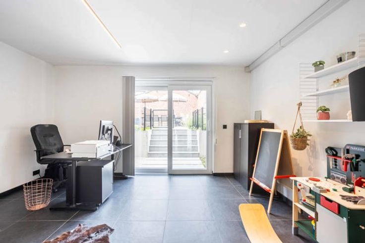 Deze ruime, energiezuinige bel-étage woning (EPC A!) biedt het comfort van een nieuwbouw (2018) op wandelafstand van scholen, ziekenhuis, stadscentrum en kent een vlotte verbindingen richting N60 en andere uitvalswegen. Bij binnenkomst op het gelijkvloers treft u een ruime inkomhal met smeedijzeren trap die leidt naar het eerste verdiep dat bestaat uit een moderne leefruimte, gekenmerkt door een prachtige parketvloer en veel natuurlijk lichtinval dankzij de grote ramen en het ruime inpandig terras. Verder vinden we hier nog de volledig uitgeruste keuken met strak design voorzien van inbouwkasten, dubbele combi-oven, inductiekookplaat etc. Het eerste verdiep bestaat uit een master bedroom en twee kinderkamers, allen uitgerust met ingebouwde airco (plafond). De badkamer is van alle gemakken voorzien, met een inloopdouche, ligbad, dubbele wastafel en toilet. Daarnaast is er op het bovenste verdiep een bergzolder voor extra opbergruimte. Het gelijkvloers bestaat uit een uitgestrekte garage, voorzien van wasruimte en apart toilet. Verder vinden we hier nog een extra kamer die gebruikt kan worden als slaapkamer, ruimte vrij beroep of hobbyruimte, met de mogelijkheid om sanitaire voorzieningen te installeren (alle leidingen zitten klaar). Aansluitend geeft het gelijkvloers toegang tot de aangename stadstuin en terras die miniem zijn in onderhoud. Deze woning straalt kwaliteit en degelijkheid uit en is voorzien van talrijke technische zaken zoals 16 zonnepanelen met thuisbatterij, ee