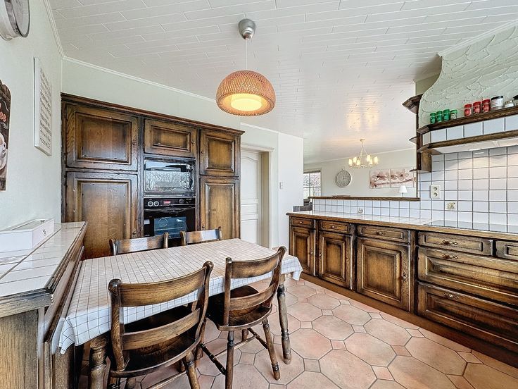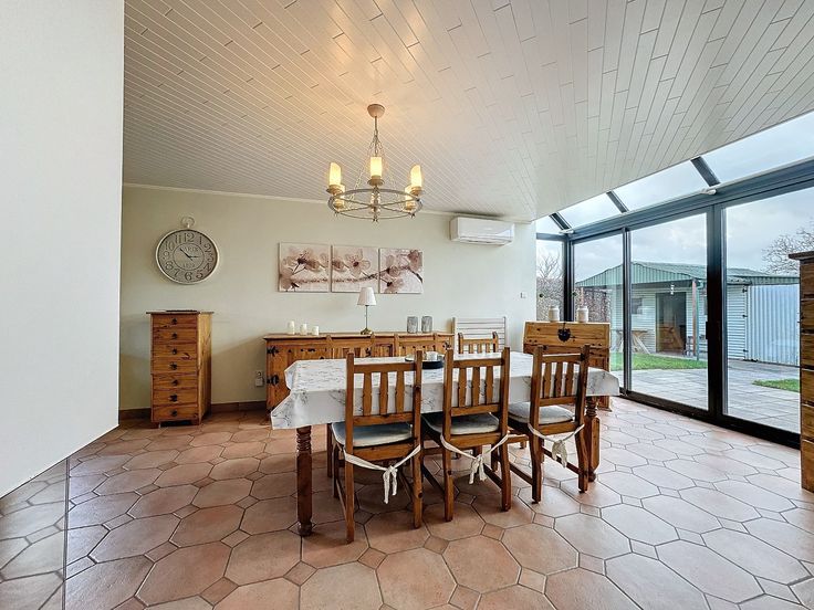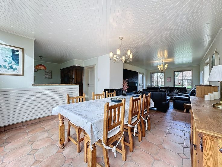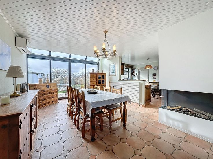 Indeling: inkomhal, gezellige leefruimte en eetplaats voorzien van gashaard en lucht/lucht warmtepomp, keuken met geïnstalleerde toestellen, toilet, wasplaats met douchecabine, ruime garage.