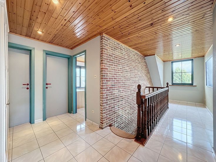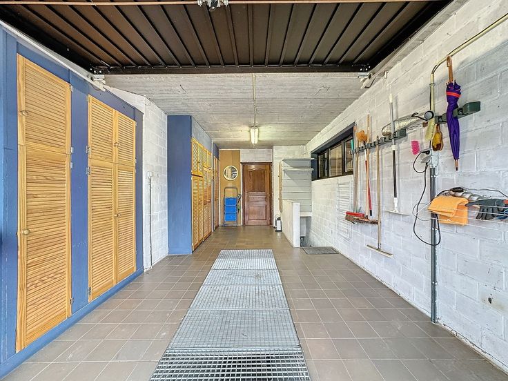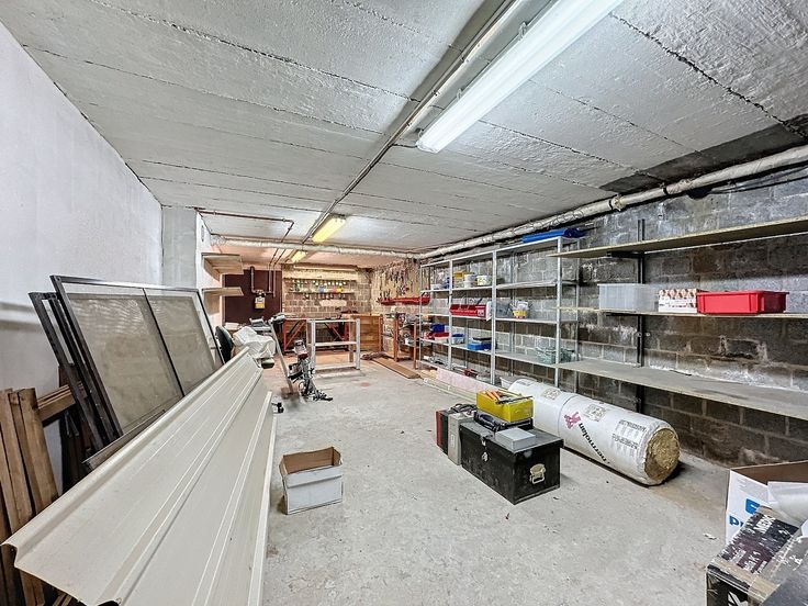 Er is een geïsoleerde zolder, bereikbaar via valluik en een zeer grote kelder (100 m²) welke dienst doet als bergplaats, wasplaats, stockageruimte, ...