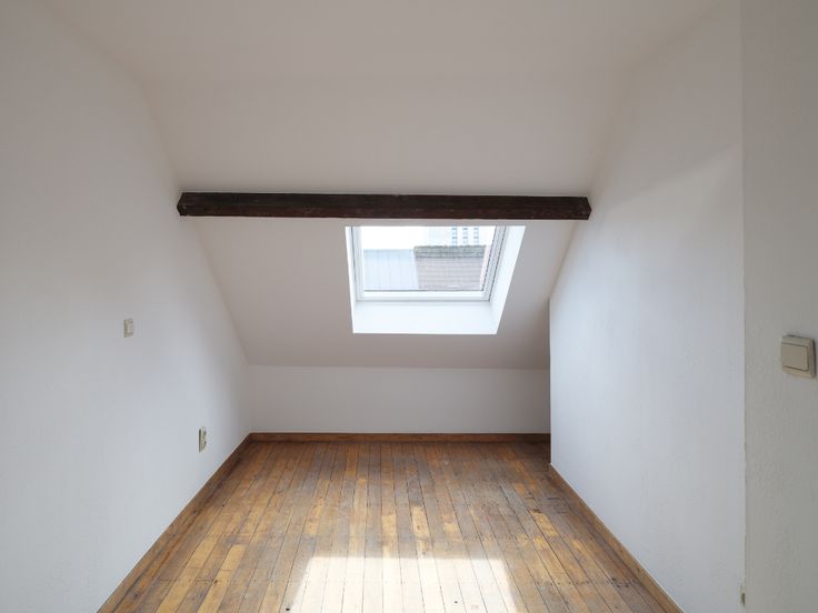 Binnenin vinden we een ruime woonkamer, keuken en badkamer, waarbij een ingebouwde kast zich over de volledige lengte van het appartement strekt. Een binnentrap leidt naar de bovenverdieping, waar zich twee aparte slaapkamers bevinden, elk voorzien van meerdere Velux-ramen.