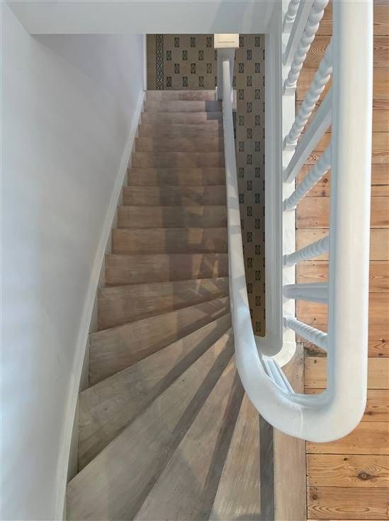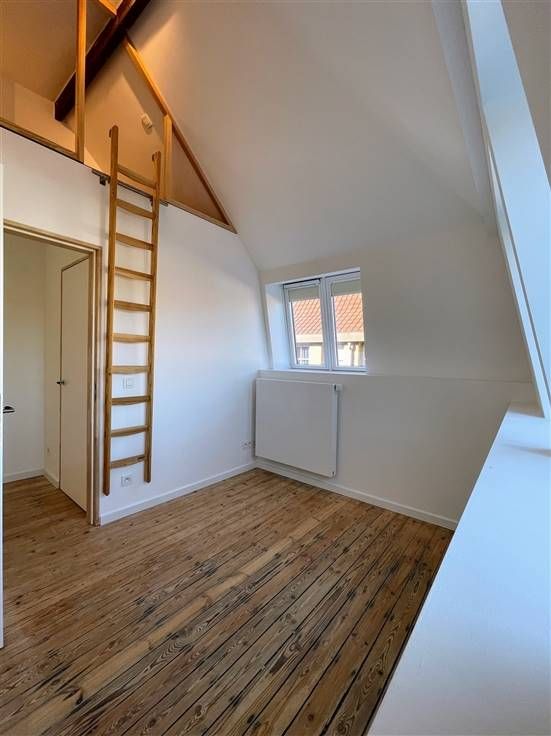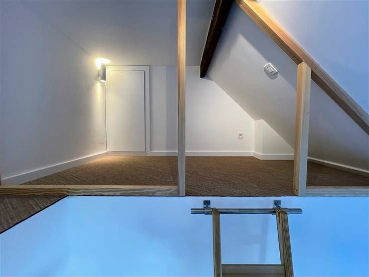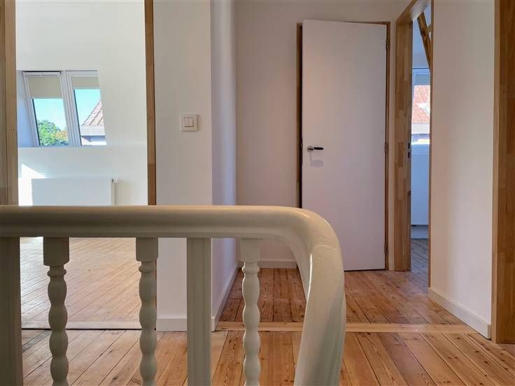 Op de eerste verdieping vind je een overloop met 3 slaapkamers met originele plancher-vloer, waarvan 2 kamers met een mezzanine.
