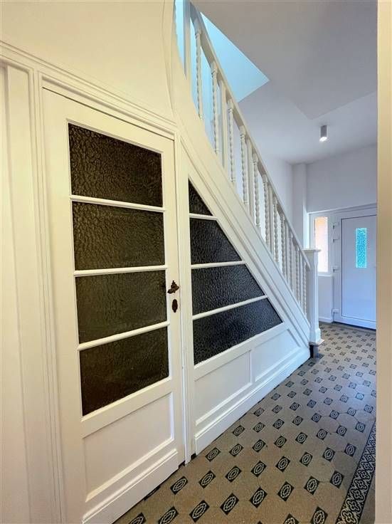 Bij binnenkomst word je verwelkomd door de originele tegelvloer in de hal. Hier vind je ook een gastentoilet met handenwasser, een vestiaire en toegang tot de kelder. De moderne open keuken, compleet met alle benodigde faciliteiten, leidt naar een handige bijkeuken.