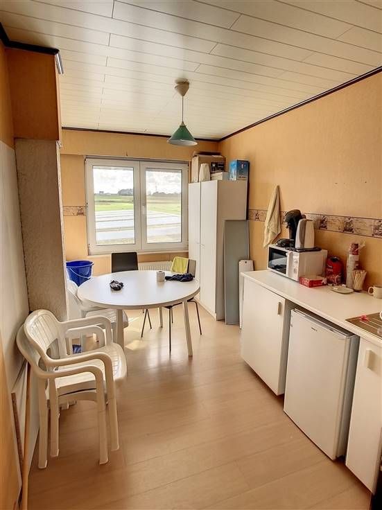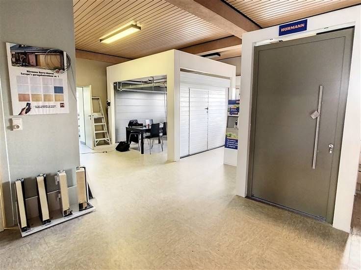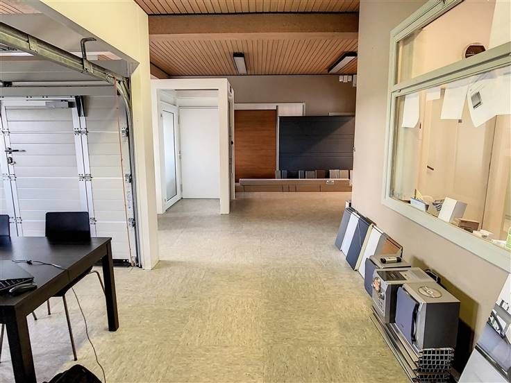 GELIJKVLOERS: handelsruimte (220m²) met C-label bestaande uit een toonzaal met open karakter, een gang met ingemaakte kast en een toilet, 2 opberglokalen en een eetruimte.