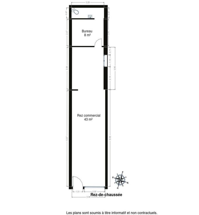 - Surface : 54 m² de surface commerciale au rez-de-chaussée, avec un espace bureau de 7 m².