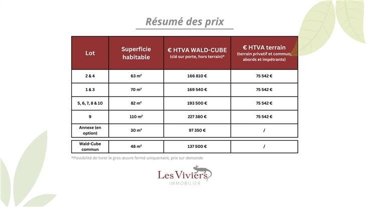 We presenteren dit unieke en atypische project van gegroepeerde en participatieve huisvesting! Het is in het hart van een kleine landschappelijke vallei van de Condroz Namurois, in een bucolisch en landelijk dorpje, op een weide van 2,5 hectare dat de toekomstige ecologische constructies op palen, bioklimatologisch en energiebesparend (concept WALD-CUBES van de coöperatieve Ecolodge) zullen worden opgericht. De geplande woonoppervlaktes variëren van 63 tot 110 m2, met de mogelijkheid om een bijgebouw van 30 m2 toe te voegen om de meeste eenheden aan te vullen. Het project omvat een aantal gemeenschappelijke ruimtes, zoals een multifunctioneel gebouw van 50 m2, een collectieve permacultuur moestuin, een weide en een boomgaard, een wetland om de biodiversiteit te vergroten, parkeerplaatsen, etc. De verkoopprijzen variëren afhankelijk van het model. Ze beginnen bij € 315.000 (inclusief btw), waarbij alles is inbegrepen: hoofdwoning, omgeving, grond, gemeenschappelijk gebouw, ontwikkelingskosten, btw, enz. De bouwvergunning is eind 2022 verleend, dus het project kan snel van start gaan in 2024. Neem contact met ons op voor meer informatie!