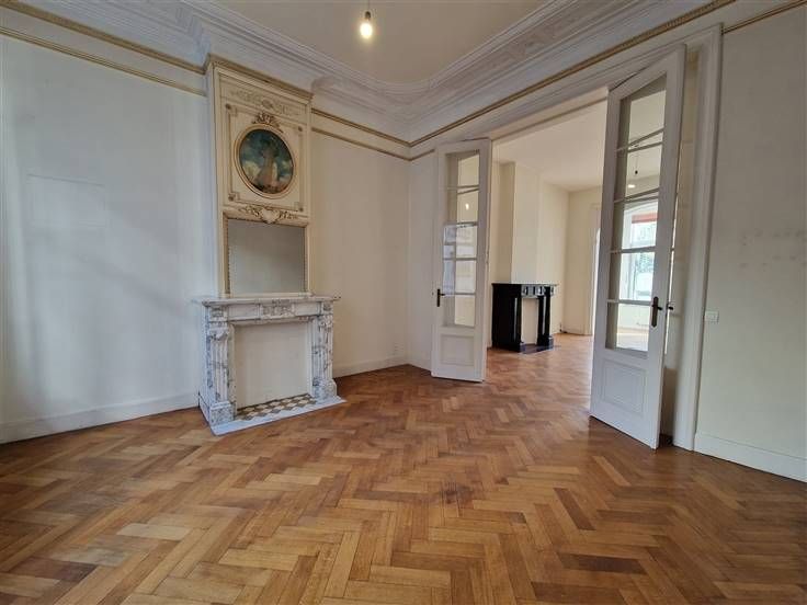De ingang van het appartement leidt naar een ruime woonkamer met een prachtige visgraat parketvloer die de traditionele elegantie van de ruimtes accentueert. Grote ramen baden het interieur in natuurlijk licht en creëren een warme en uitnodigende sfeer.