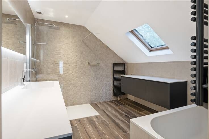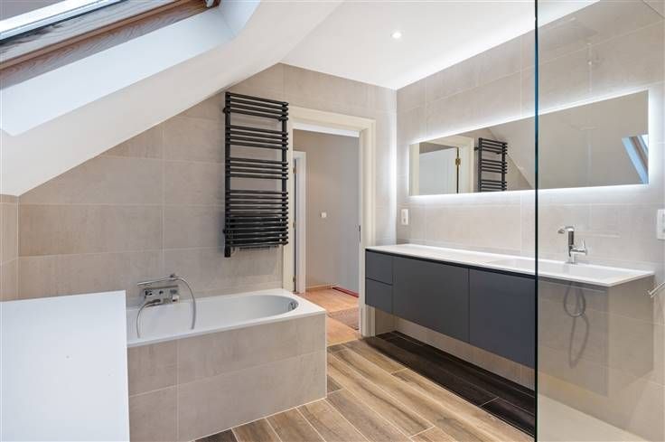 Op de eerste verdieping geeft de overloop ons toegang tot de badkamer (met lavabomeubel, kast, douche en ligbad), het apart toilet en de drie slaapkamers (9,50m², 12,50m² en 17m²).