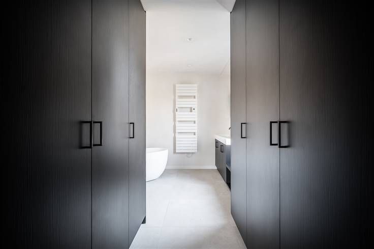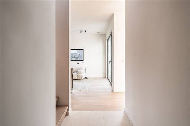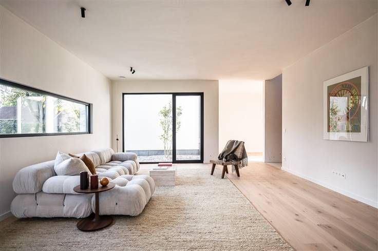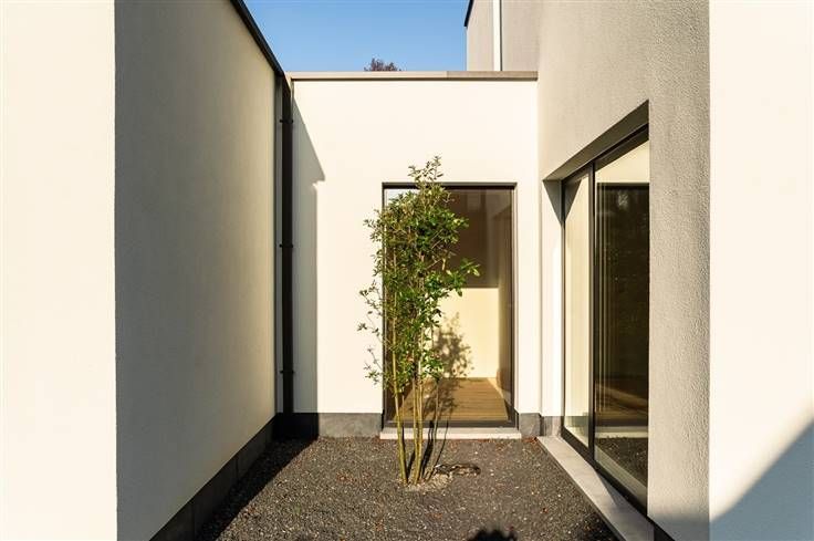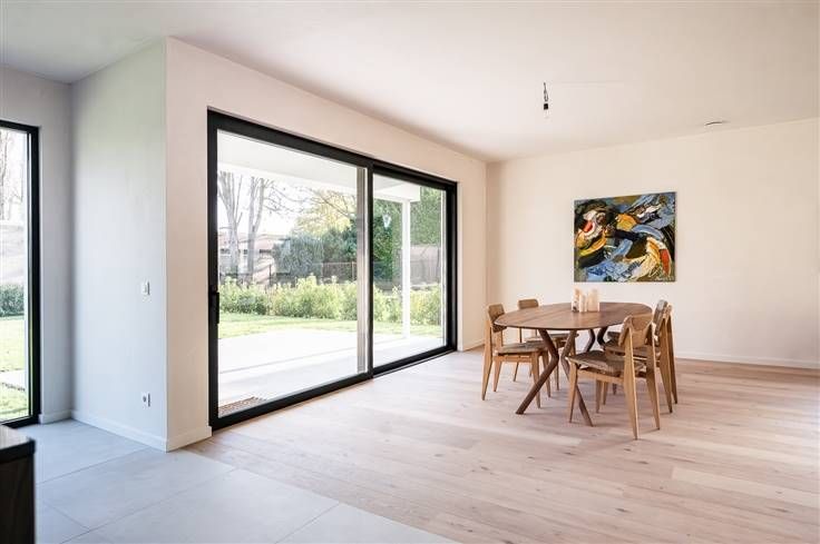 Moderne en energiezuinige nieuwbouwvilla met een hedendaagse architectuur. Deze moderne en energiezuinige villa heeft een bewoonbare oppervlakte van 241 m² en beschikt over een hedendaagse architectuur. Verkoop onder 6% BTW mogelijk tot het eind van dit jaar. Bij de binnenkomst verwelkomd in een inkomhal, waar een vestiaire discreet is weggewerkt achter een verfijnde walnoot houten wand. Daarnaast hebben we een bureauruimte met uitzicht op de patio. De living, die naadloos overgaat in het eetgedeelte en de keuken, versterkt het gevoel van ruimte. De keuken, met een centraal keukeneiland, is uitgerust met hoogwaardige apparatuur, waaronder een inductiekookplaat met geïntegreerde dampkap. De open keuken biedt ook toegang tot de tuin, waardoor er een voortdurende verbinding is met de groene omgeving. Voor het interieur is gekozen voor natuurlijke materialen zoals parket en natuursteen, gecombineerd met een licht kleurenpalet, wat een luchtige sfeer creëert. Als extra is er een praktische berging, voorzien van ingebouwde kasten. Op de eerste verdieping bevinden zich twee slaapkamers en een badkamer die is uitgerust met een dubbele lavabo en een inloopdouche. De masterbedroom heeft een dressing en een en-suite badkamer, voorzien van een inloopdouche, ligbad en dubbele lavabo. De zuidoost georiënteerde tuin is zeer onderhoudsvriendelijk aangelegd en volop in groei. Er zijn voldoende parkeerplaats