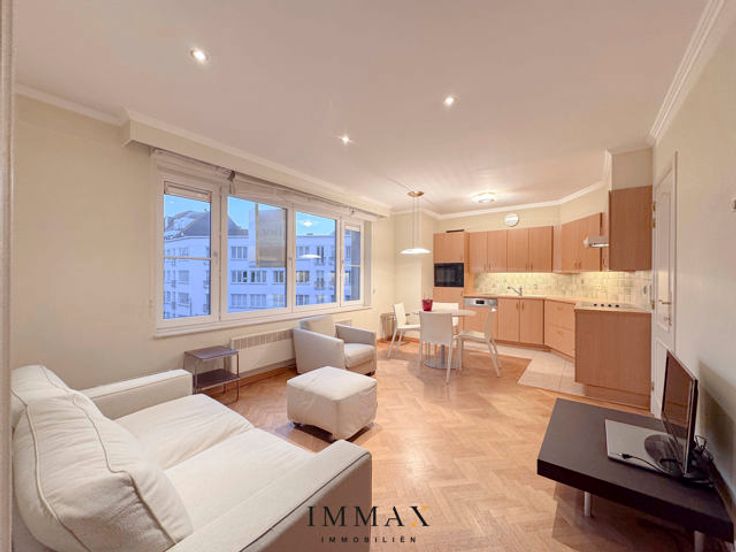 Dit gemeubileerde appartement aan de Koningslaan in Knokke biedt een uitstekende ligging, op wandelafstand van het Rubensplein en de Zeedijk, met een schitterend open uitzicht. Bij binnenkomst betreedt u de inkomhal met vestiaire en een apart gastentoilet. De ruime leefruimte geniet van veel natuurlijke lichtinval en sluit naadloos aan op de volledig uitgeruste keuken met aansluitende praktische berging. Verder beschikt het appartement over één slaapkamer en een badkamer. Extra opbergruimte en een fietsenberging zijn aanwezig in het gebouw. Aarzel niet om ons te contacteren voor meer informatie: tel. : 050 62 44 14 of via knokke@immax.be