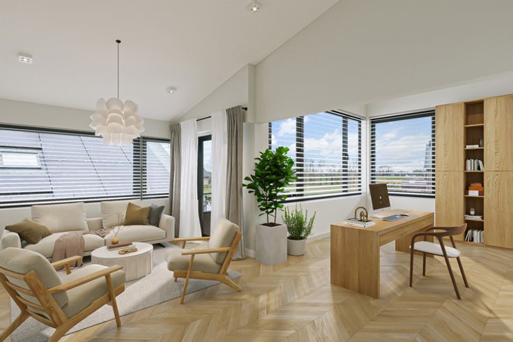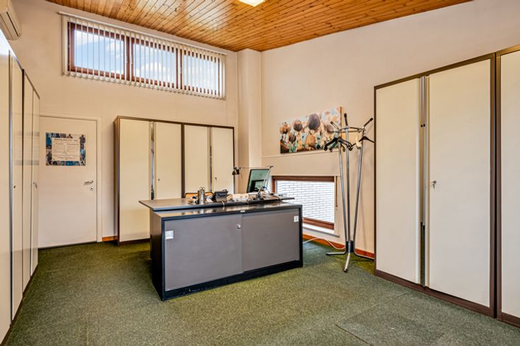 Via de trap komen we op de eerste verdieping die momenteel ingedeeld is als bureauruimte, toilet, en tevens een ruime zolder. Dit verdiep kan heringericht worden als extra slaapkamers of kangeroewoning.