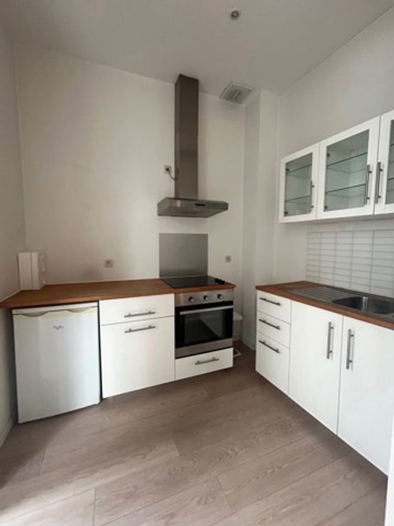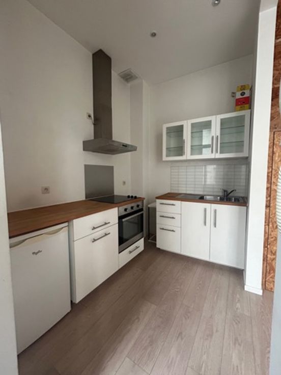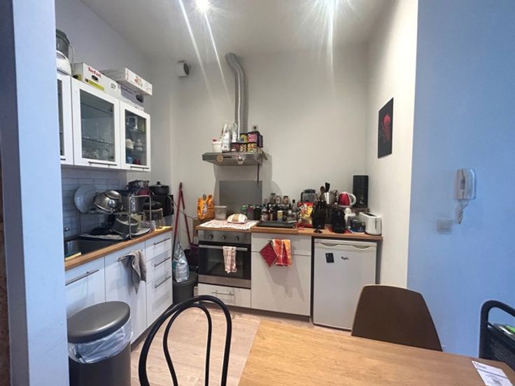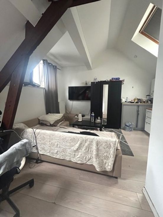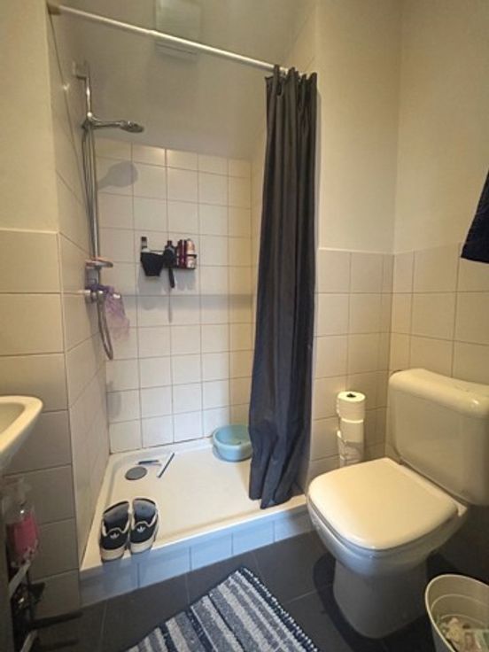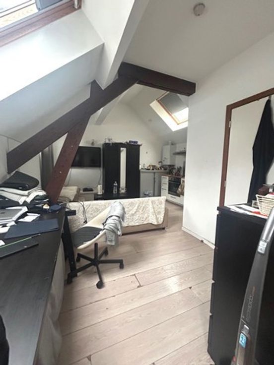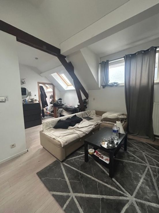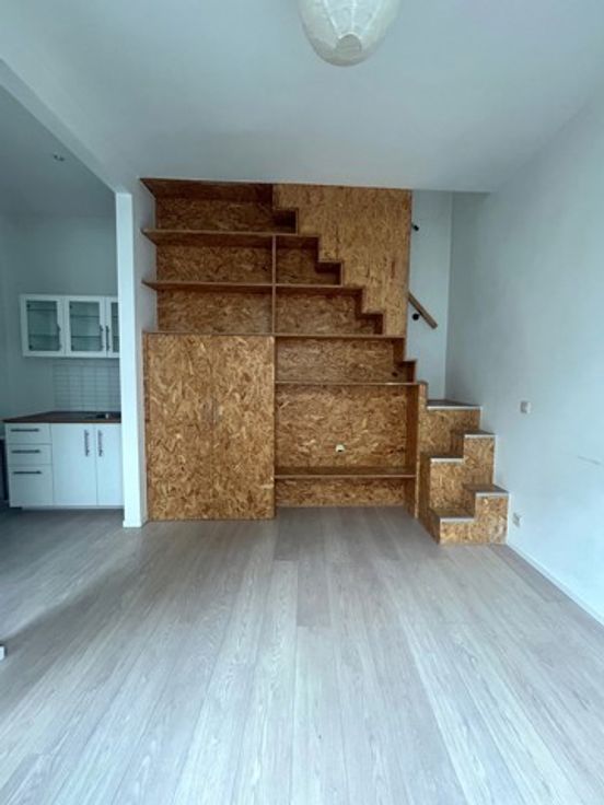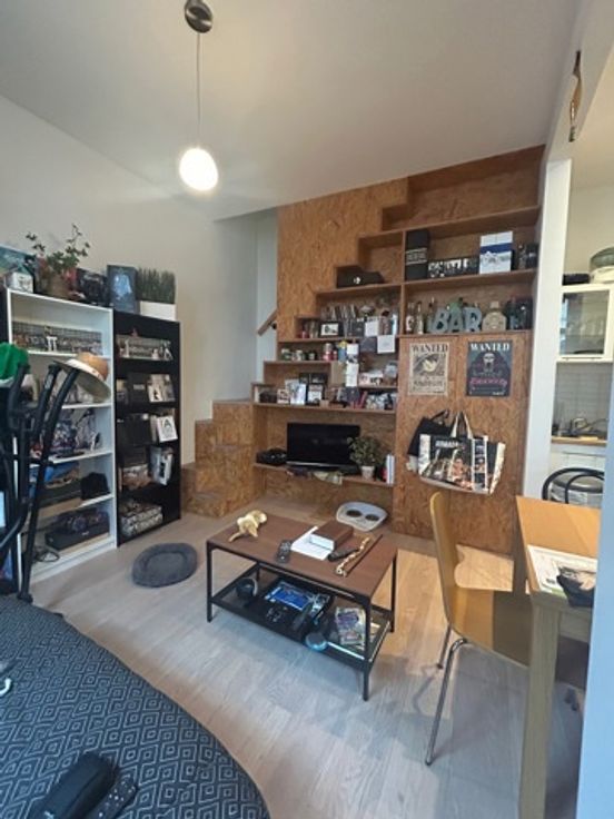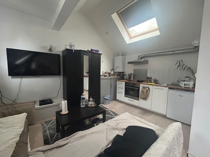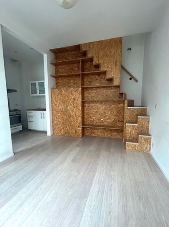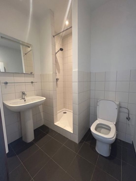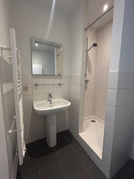 Un studio de +/- 25 m² avec cuisine et salle de douche avec WC + espace de rangement sur palier de +/- 2 m². PEB D-.