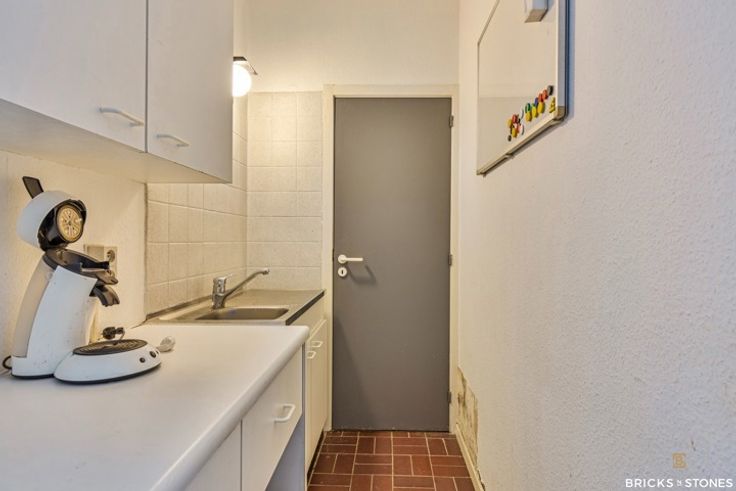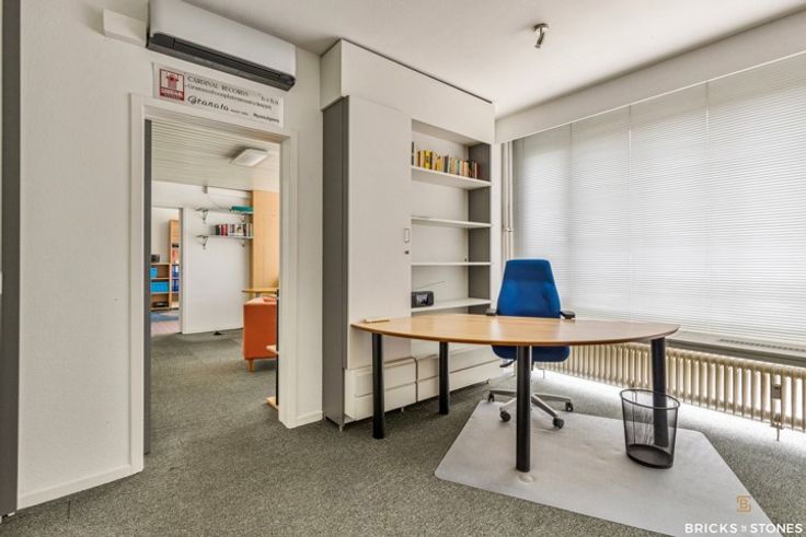 De indeling is als volgt: inkomhal, eerste ruimte, achteraan een ingerichte keuken met privatief toilet, en twee afgesloten bureelruimtes voorzien van ingemaakte kasten.
