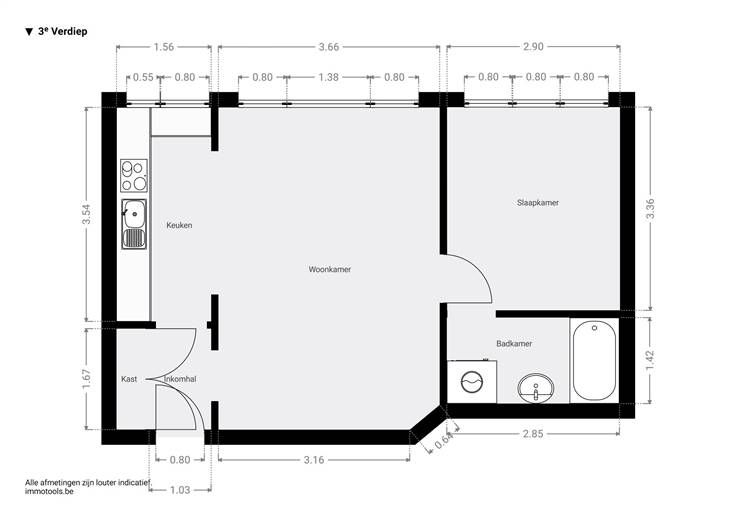 In een kleinschalig, verzorgd gebouw vind je op de derde verdieping dit appartement, waar je binnenkomt in de inkomhal op een doorlopende laminaatvloer, met z’n handige vestiairekast. Verderop stap je de leefruimte in, een lichte, open plek met een kamerbreed raam dat uitkijkt op groen, met plaats voor een zetel en een eethoek. De open keuken in L-vorm heeft een praktische tegelvloer en is volledig geïnstalleerd. Je vindt hier een elektrisch vuur, dampkap, dubbele spoelbak, koelkast, een betegelde spatwand en heel wat kastruimte. Het halfhoge muurtje zorgt voor een subtiele afscheiding, en biedt plaats om enkele verse kruiden op te zetten, bijvoorbeeld. Aan de andere kant van de leefruimte neem je de deur naar de aparte slaapkamer, met z’n aanpalende badkamer. Ook die slaapkamer is enorm licht, dankzij het grote raam dat uitgeeft op groen, en met plaats voor een dubbel bed en een kleerkast. De betegelde badkamer heeft een ligbad met een douchewand, een lavabo met spiegel, verlichting en onderkast, een wc en een automatisch afzuigsysteem. Je woont hier in hartje Linkeroever, op wandelafstand van de St. Annatunnel, die je zo de stad in brengt. Met een velo-station vlak voor het appartement en een metrostation in de buurt, ben je hier heel mobiel en de stad zo in en weer uit. Op Sint Anneke plage, met z’n wandelboulevard en heel wat horeca, ben je zo en ook in het St. Annabos. Meer info: https://www.immovasta.be/panden/gegevens/13537/