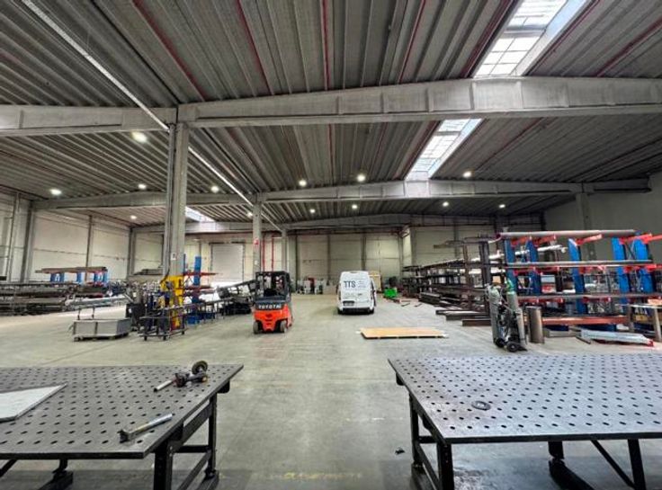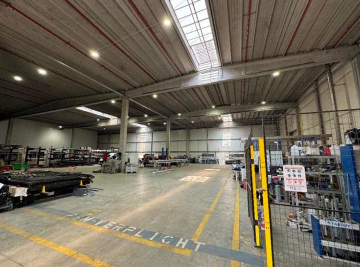 -Betonstructuur met een vrije hoogte van 9 m onder de balken, polybetonvloer, gesprinklerd en voorzien van dakisolatie (6 cm) en LED-verlichting.