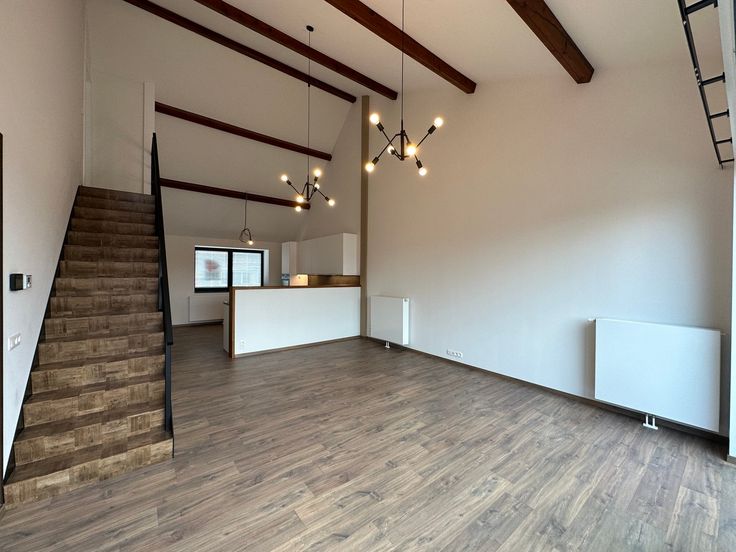 Na het betreden van de glazen deur komt u in de ruime woonkamer, die naadloos overgaat in een moderne en open keuken. De woonkamer biedt voldoende ruimte voor al uw entertainmentbehoeften en heeft zelfs ingebouwde kasten onder de trap voor extra opslag.