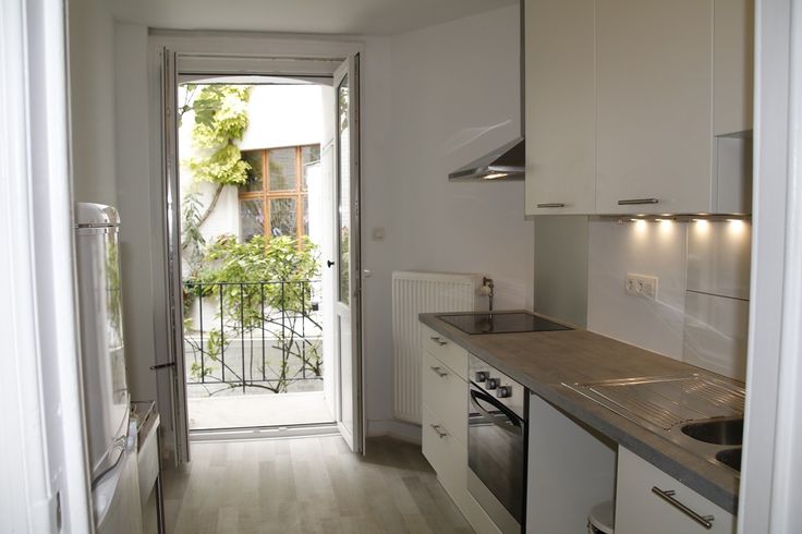Eerste verdieping: 3 woonkamers in een rij, waarvan een met privétoegang + ingerichte keuken met klein balkon.
