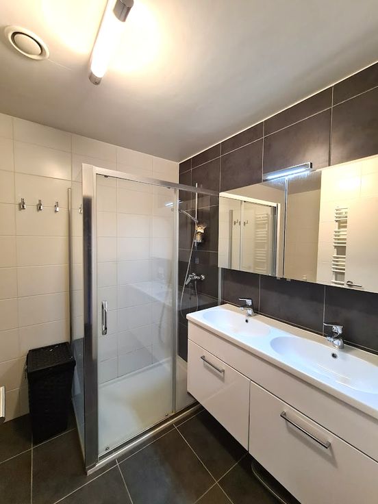 2de verdieping: 2 slaapkamers, badkamer met douche, dubbele lavabo en toilet, aparte bergruimte/wasruimte.