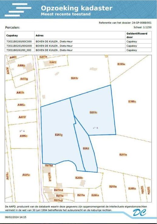 STAD TONGEREN, dertiende afdeling, deelgemeente DIETS-HEUR 1) Een perceel boomgaard hoog gelegen Boven de Kuilen, gekadastreerd volgens recent kadastraal uittreksel sectie B, nummer 0260CP0000, met een oppervlakte van zevenenveertig are zestig centiare (47 a 60 ca). Niet-geïndexeerd kadastraal inkomen: dertig euro (€ 30,00). 2) Een perceel boomgaard hoog gelegen Boven de Kuilen, gekadastreerd volgens recent kadastraal uittreksel sectie B, nummer 0261GP0000, met een oppervlakte van tweeënzestig are (62 a). Niet-geïndexeerd kadastraal inkomen: veertig euro (€ 40,00). 3) Een perceel boomgaard hoog gelegen Boven de Kuilen, gekadastreerd volgens recent kadastraal uittreksel sectie B, nummer 0262P0000, met een oppervlakte van zeventien are éénenz(17 a 61 ca). Niet-geïndexeerd kadastraal inkomen: elf euro (€ 11,00). Verpacht P score: D